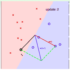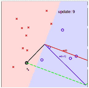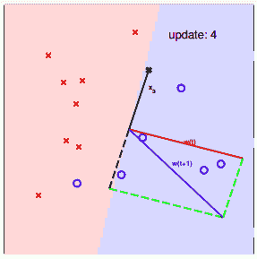 ,那表示w和x夹角小于90度,其中w是直线的法向量。所以,x被误分在直线的上侧,修正的方法就是使w和x夹角大于90度。通常做法是