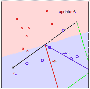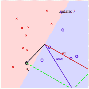 与x夹角小于90度,能保证x位于直线的上侧,则对误分为负类的错误点完成了直线修正。