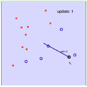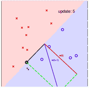 ,那表示w和x夹角大于90度,其中w是直线的法向量。所以,x被误分在直线的下侧(相对于法向量,法向量的方向即为正类所在的一侧),修正的方法就是使w和x夹角小于90度。通常做法是