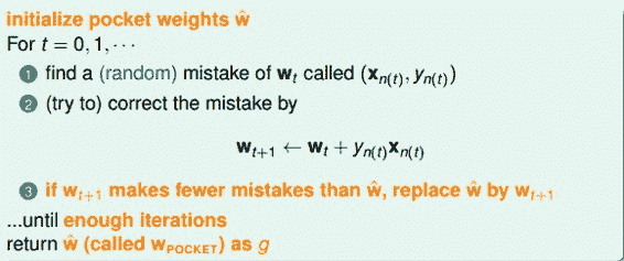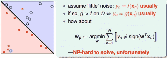 事实证明,上面的解是NP-hard问题,难以求解。然而,我们可以对在线性可分类型中表现很好的PLA做个修改,把它应用到非线性可分类型中,获得近似最好的g。