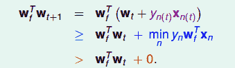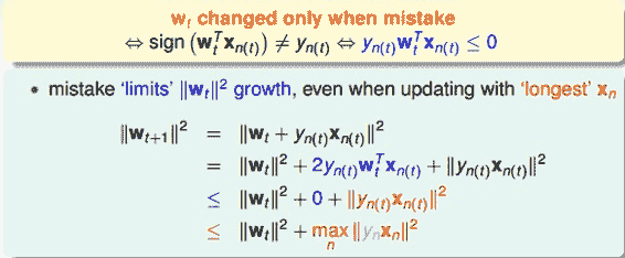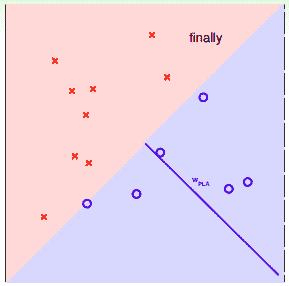 的是随着迭代次数增加,逐渐接近的。而且,PLA最终会停下来(因为T有上界),实现对线性可分的数据集完全分类。