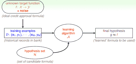 引入这样一个例子:某银行要根据用户的年龄、性别、年收入等情况来判断是否给该用户发信用卡。现在有训练样本D,即之前用户的信息和是否发了信用卡。这是一个典型的机器学习问题,我们要根据D,通过A,在H中选择最好的h,得到g,接近目标函数f,也就是根据先验知识建立是否给用户发信用卡的模型。银行用这个模型对以后用户进行判断:发信用卡(+1),不发信用卡(-1)。