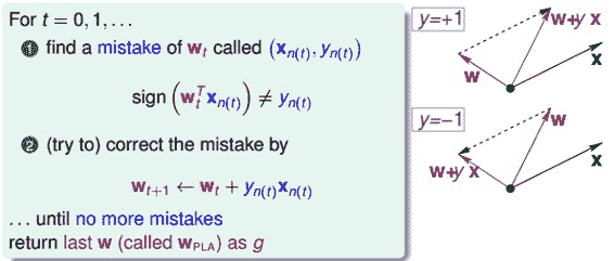 根据上一部分的介绍,我们已经知道了hypothesis set由许多条直线构成。接下来,我们的目的就是如何设计一个演算法A,来选择一个最好的直线,能将平面上所有的正类和负类完全分开,也就是找到最好的g,使