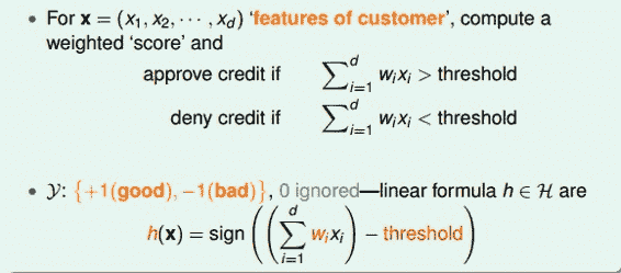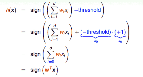 还是刚才银行是否给用户发信用卡的例子,我们把用户的个人信息作为特征向量x,令总共有d个特征,每个特征赋予不同的权重w,表示该特征对输出(是否发信用卡)的影响有多大。那所有特征的加权和的值与一个设定的阈值threshold进行比较:大于这个阈值,输出为+1,即发信用卡;小于这个阈值,输出为-1,即不发信用卡。感知机模型,就是当特征加权和与阈值的差大于或等于0,则输出h(x)=1;当特征加权和与阈值的差小于0,则输出h(x)=-1,而我们的目的就是计算出所有权值w和阈值threshold。