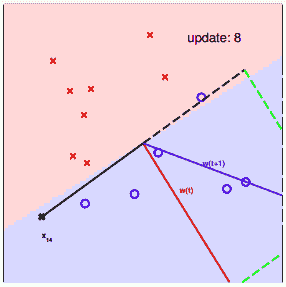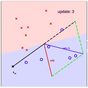 按照这种思想,遇到个错误点就进行修正,不断迭代。要注意一点:每次修正直线,可能使之前分类正确的点变成错误点,这是可能发生的。但是没关系,不断迭代,不断修正,最终会将所有点完全正确分类(PLA前提是线性可分的)。这种做法的思想是“知错能改”,有句话形容它:“A fault confessed is half redressed.”