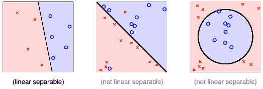 PLA什么时候会停下来呢?根据PLA的定义,当找到一条直线,能将所有平面上的点都分类正确,那么PLA就停止了。要达到这个终止条件,就必须保证D是线性可分(linear separable)。如果是非线性可分的,那么,PLA就不会停止。