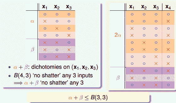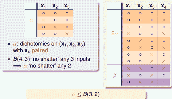 首先,把B(4,3)所有情况写下来,共有11组。也就是说再加一种dichotomy,任意三点都能被shattered,11是极限。
