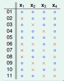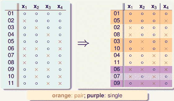 对这11种dichotomy分组,目前分成两组,分别是orange和purple,orange的特点是,x1,x2和x3是一致的,x4不同并成对,例如1和5,2和8等,purple则是单一的,x1,x2,x3都不同,如6,7,9三组。