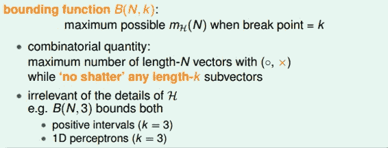 现在,我们引入一个新的函数:bounding function,B(N,k)。Bound Function指的是当break point为k的时候,成长函数