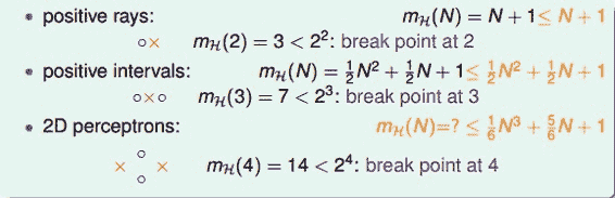 这里值得一提的是,B(N,k)的引入不考虑是1D postive intrervals问题还是2D perceptrons问题,而只关心成长函数的上界是多少,从而简化了问题的复杂度。